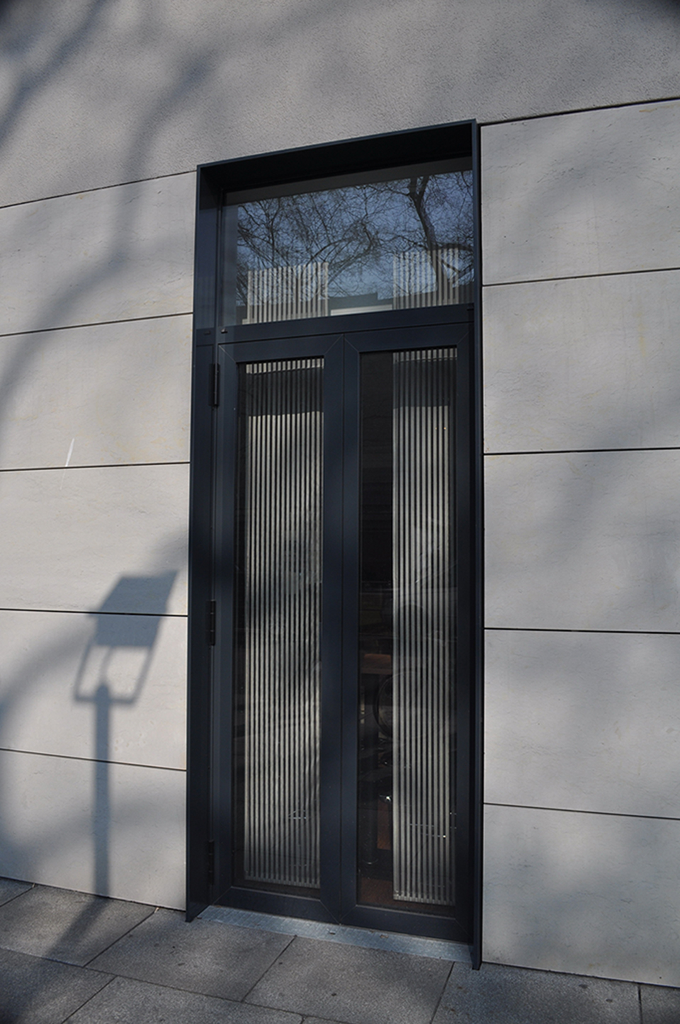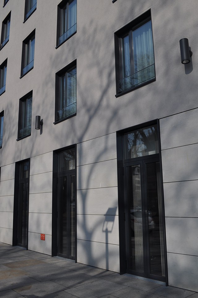 Plastic windows on upper floors, aluminium elements on the ground floor, canopy steel, glazed main entrance