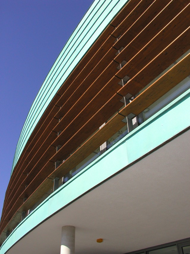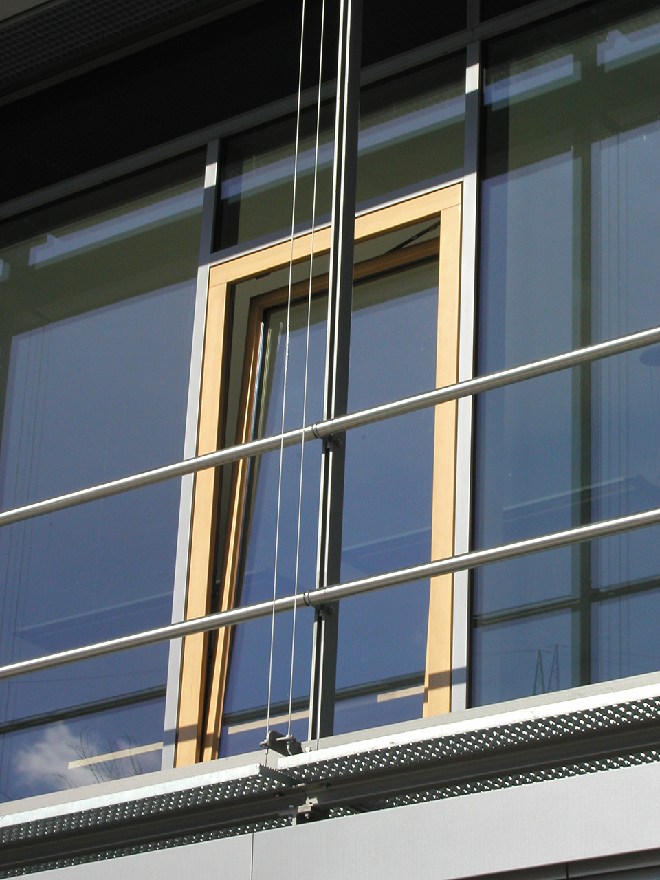 Inset window elements (wood), specially designed external blinds, rear-ventilated glass balustrades