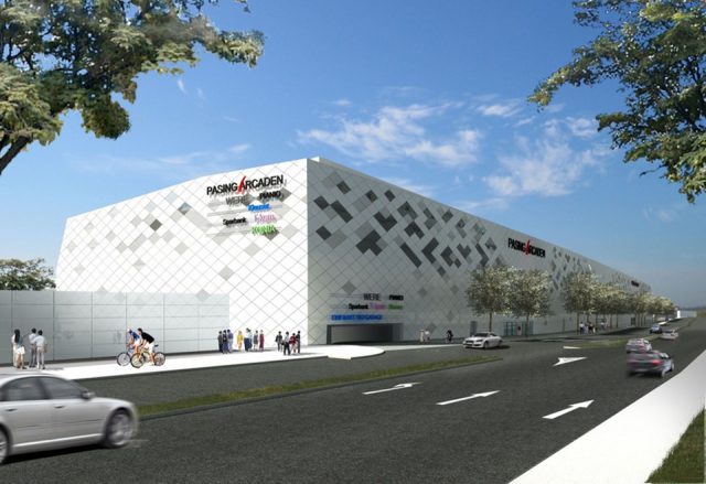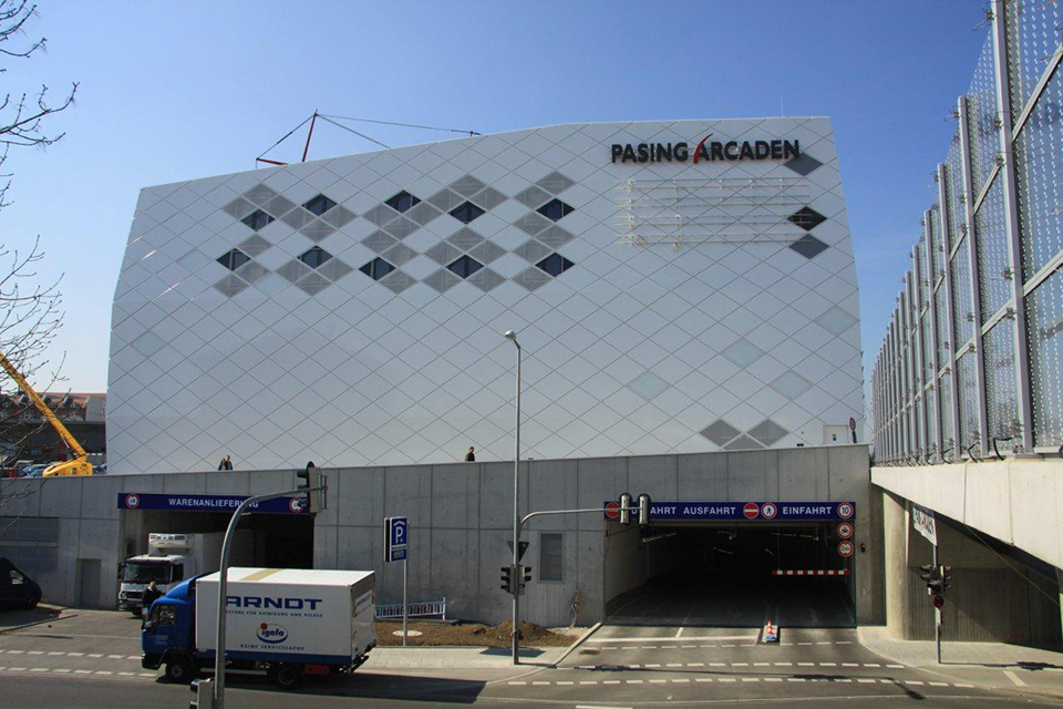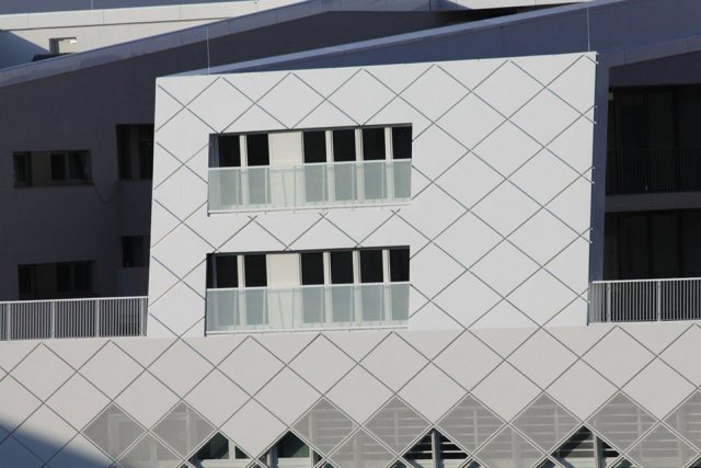 Construction: ca. 9,000 m² façade with diamond motif fascia design as a suspended structure (partly inclined inwards, in front of the solid structure and steel construction), regular diamonds –aluminium sheet ca. 7,000 m², special diamonds – illuminated diamonds ca. 100 m², glazed diamonds clear and frosted ca. 1,000 m², perforated plate diamonds ca. 500 m²