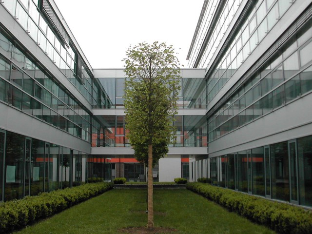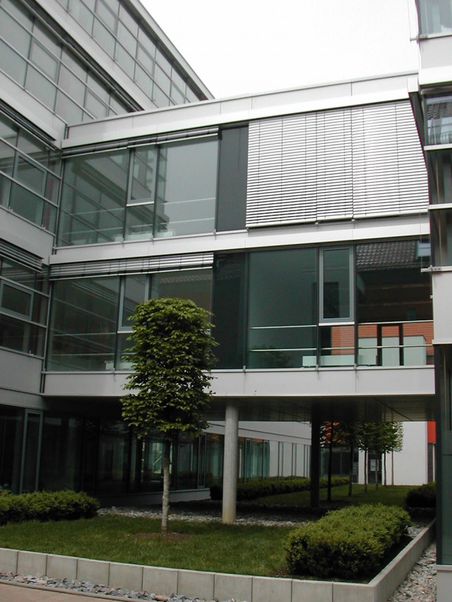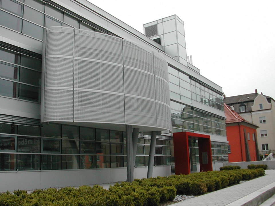 Fully-glazed cornerings, special cover caps, rear-ventilated sheet façade comprising a mullion/transom façade