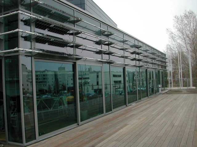 Special features: Skylight roof partly fitted with solar modules, the very wide cross-bar supports resulted in large glass loads, vertical façades, some with solar modules comprising sun-protection slats