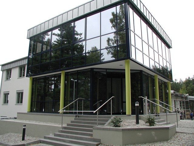 Construction: Punch-through windows with sun protection (aluminium), mullion/transom façades (aluminium), incl. inset window elements (aluminium), fire/smoke protection doors (aluminium)