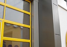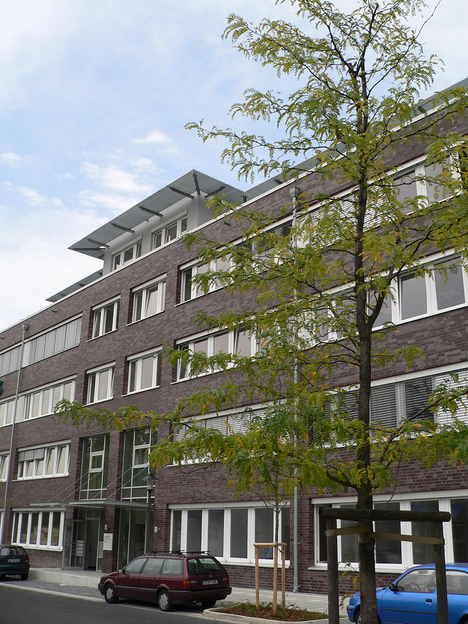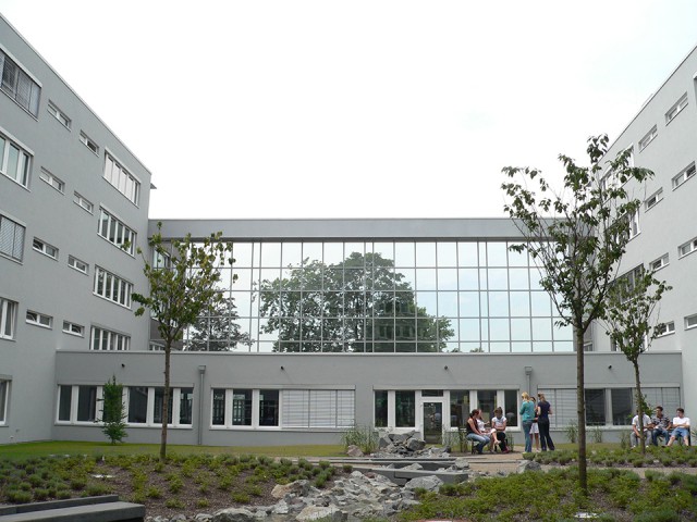 Construction: Mullion/transom stairwell façades (aluminium) incl. canopy, as well as inset window and door elements (aluminium), mullion/transom glass wall to soundproof the inner courtyard (top structure of steel)
